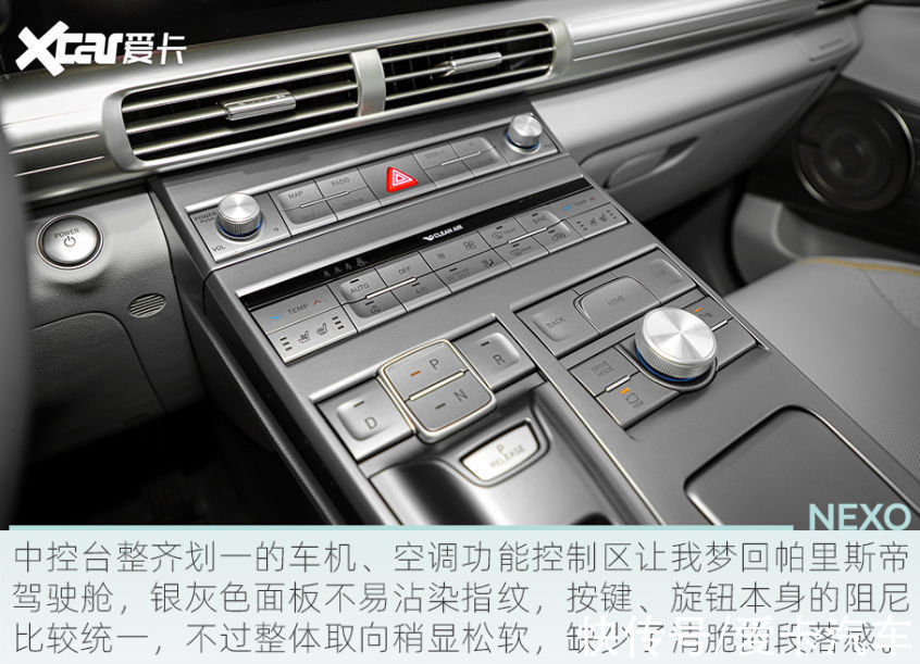 以今天的眼光看,NEXO的内饰似乎需要翻新一下了,中控台密密麻麻的按键、旋钮太过Old-fashioned,没有新能源味。但就是那些按键、旋钮,让我越看越觉得亲切。