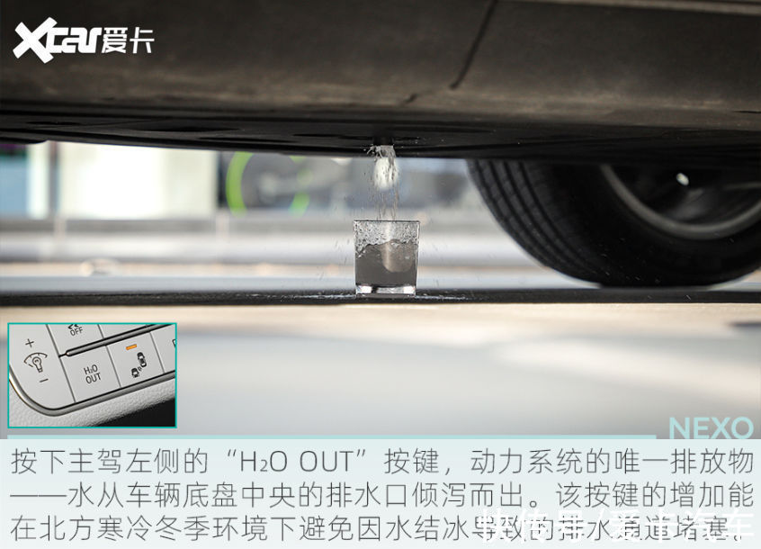动力系统产生的水会在驾驶者按下对应按键或车辆下电时从底盘中央以及车尾两侧的排水口排出,经现场检测,水体符合饮用标准。排水时水压较大,部分朋友可能会觉得声音比较尴尬。