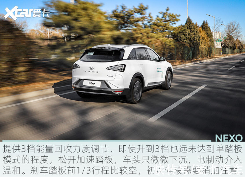 能量回收力度提供开关,开启后有3档可调,不支持单踏板模式,标定策略考虑了从燃油车转战氢燃料电池车的用户,电机正负扭矩切换线性,减速度不会来得过分积极。刹车踏板本身存在初段偏空的问题,脚感绵软,初次上手需要适应。